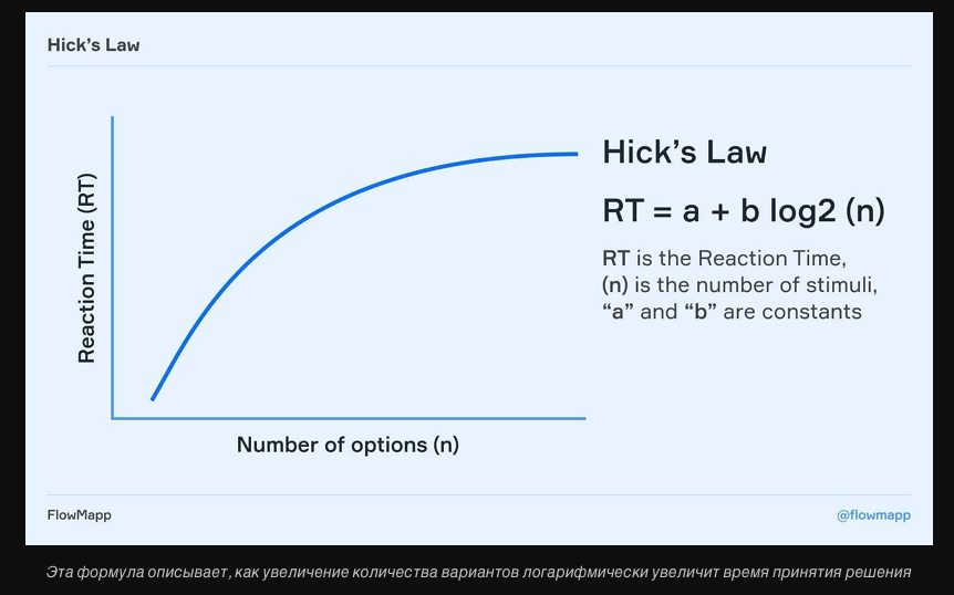 - Закон Хика. Он гласит, что время, необходимое для принятия решения, зависит от количества вариантов выбора, доступных человеку. Чем больше вариантов существует, тем больше времени нам нужно.