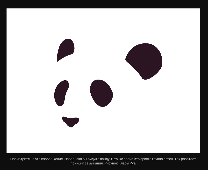 - Принцип закрытия. Когда мы смотрим на сложную группу визуальных элементов, мы склонны искать единый и узнаваемый шаблон. Человеческий мозг пытается заполнить пробелы, чтобы воспринимать разные объекты как единое целое.