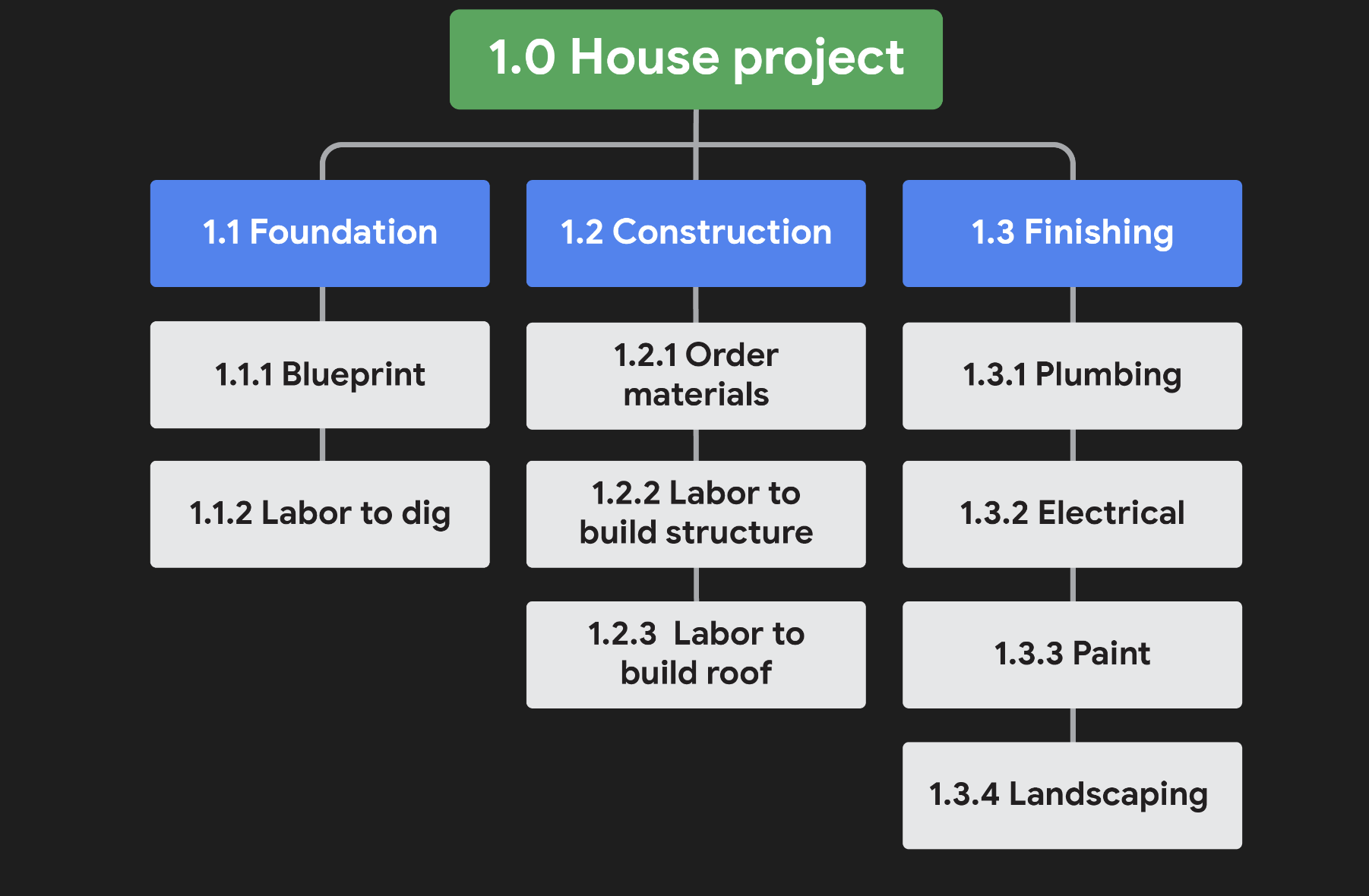 Let’s examine how this happens. David is a project manager responsible for a home construction project. Let’s check out his Work Breakdown Structure (WBS):